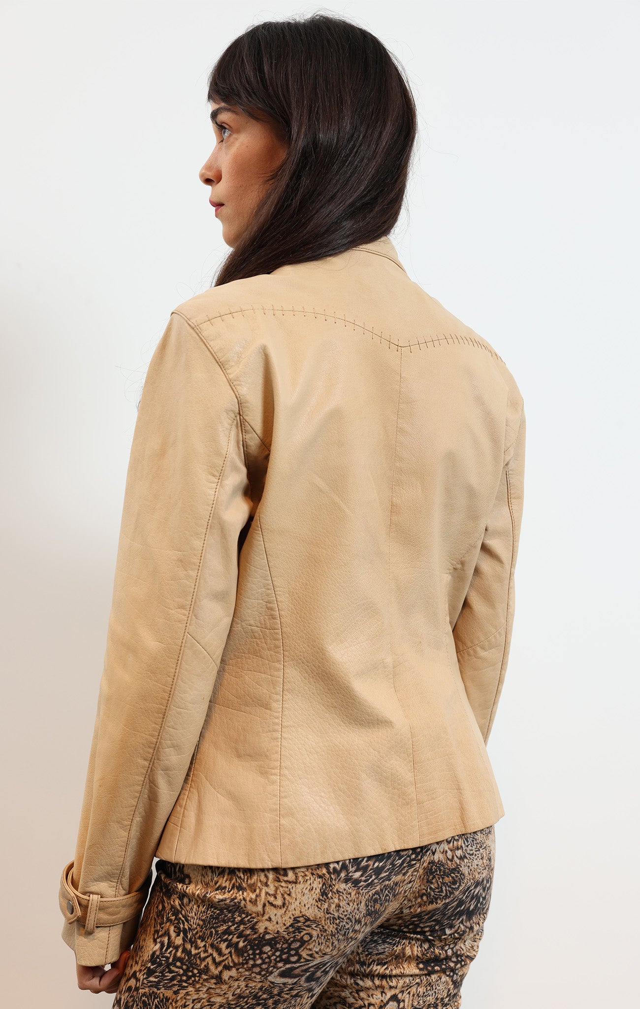 Vintage cream leather jacket with asymmetric front zip, cross-stitch seam detailing, and flap pockets. Unique handcrafted-style patterning.
