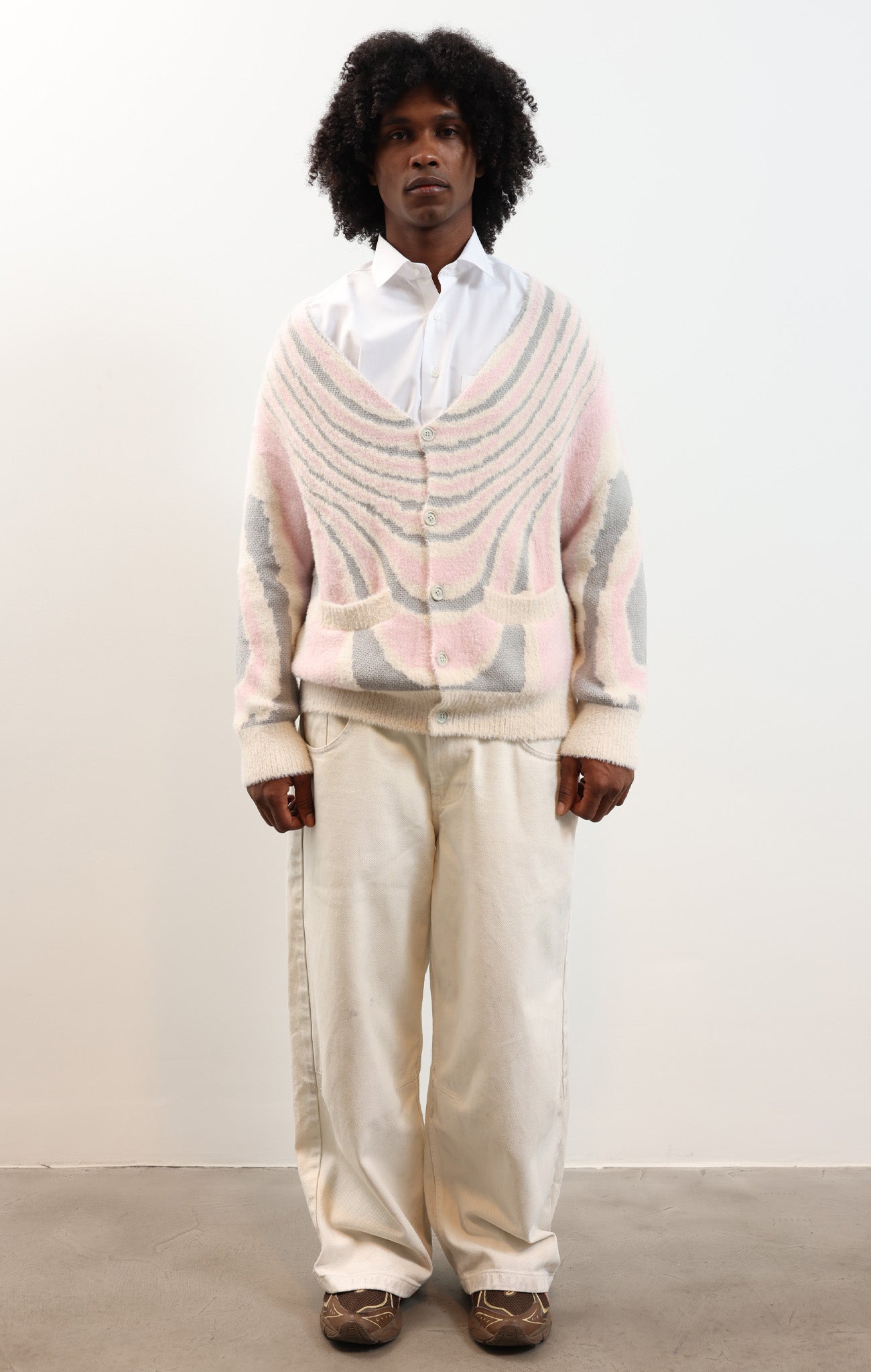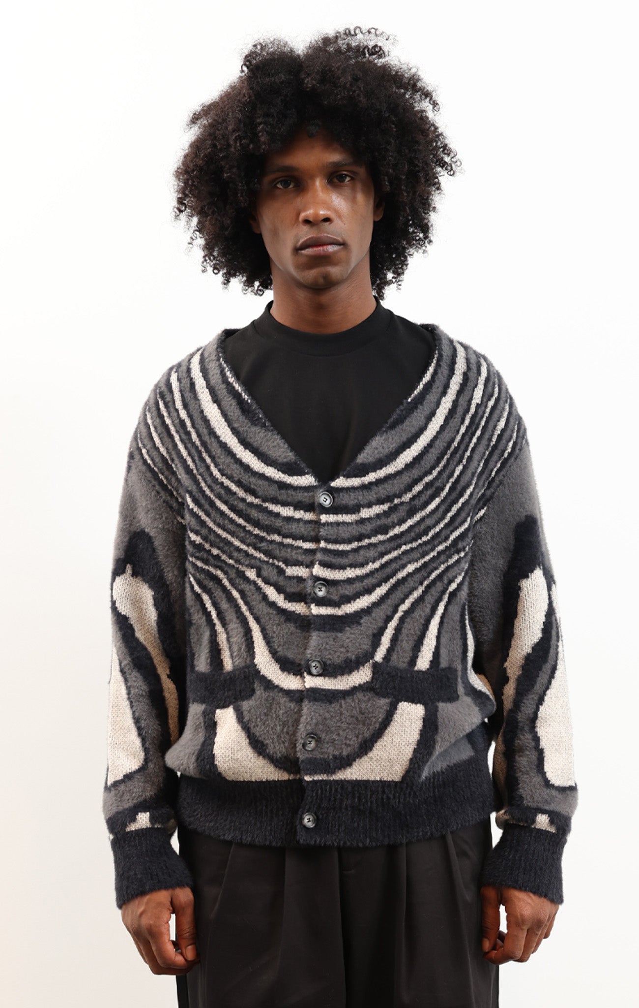An oversized cardigan crafted from soft 100% polyester with a mohair-inspired hairy texture, offering lightweight warmth and a gentle hand feel. Designed with a unique cut, it drapes effortlessly for a relaxed, fashion-forward silhouette.
